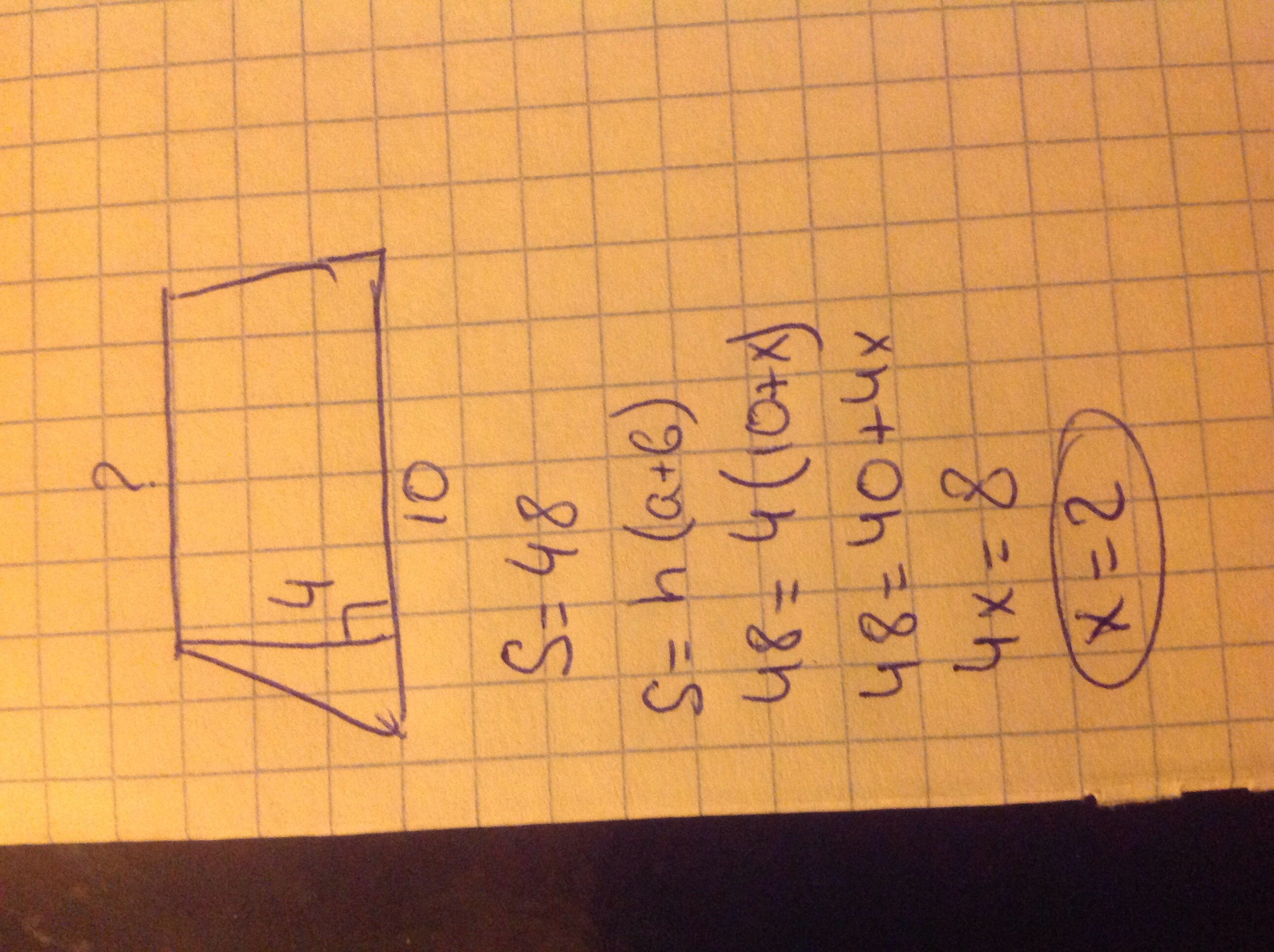 основание трапеции равно 10, высота равна 4, а площадь равна 48, найдите второе основание трапеции, БЫСТРЕЙ ПОЖАЛУЙСТА