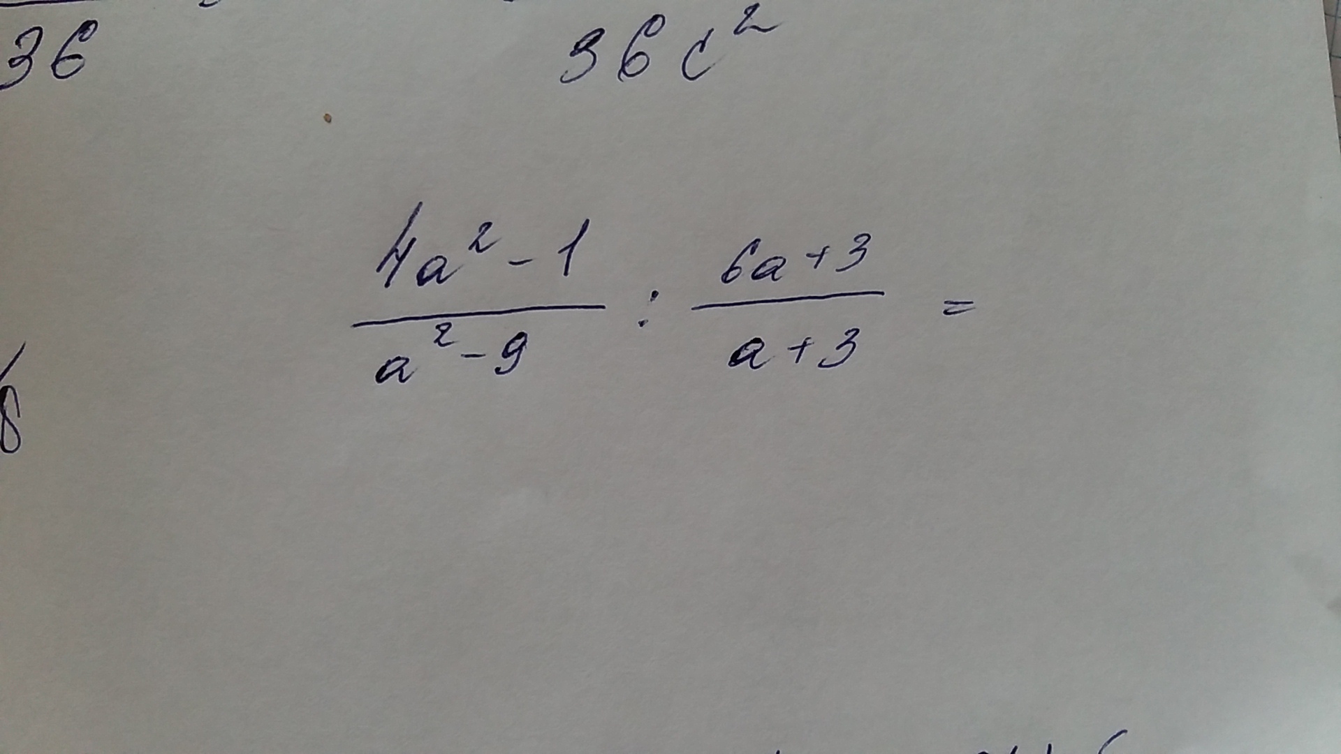 frac{4a^2-1}{a^2-9}: frac{6a+3}{a+3}= frac{(2a-1)(2a+1)}{(a-3)(a+3)}cdot frac{a+3}{3(2a+1)}= frac{2a-1}{3(a-3)}= frac{2a-1}{3a-9}