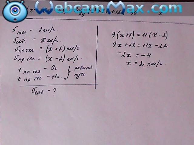 Путь пройденный за 9 часов по течению теплоход проходит против течения за 11 часов скорость течения 2км/ч Найти собственую скорость теплохода