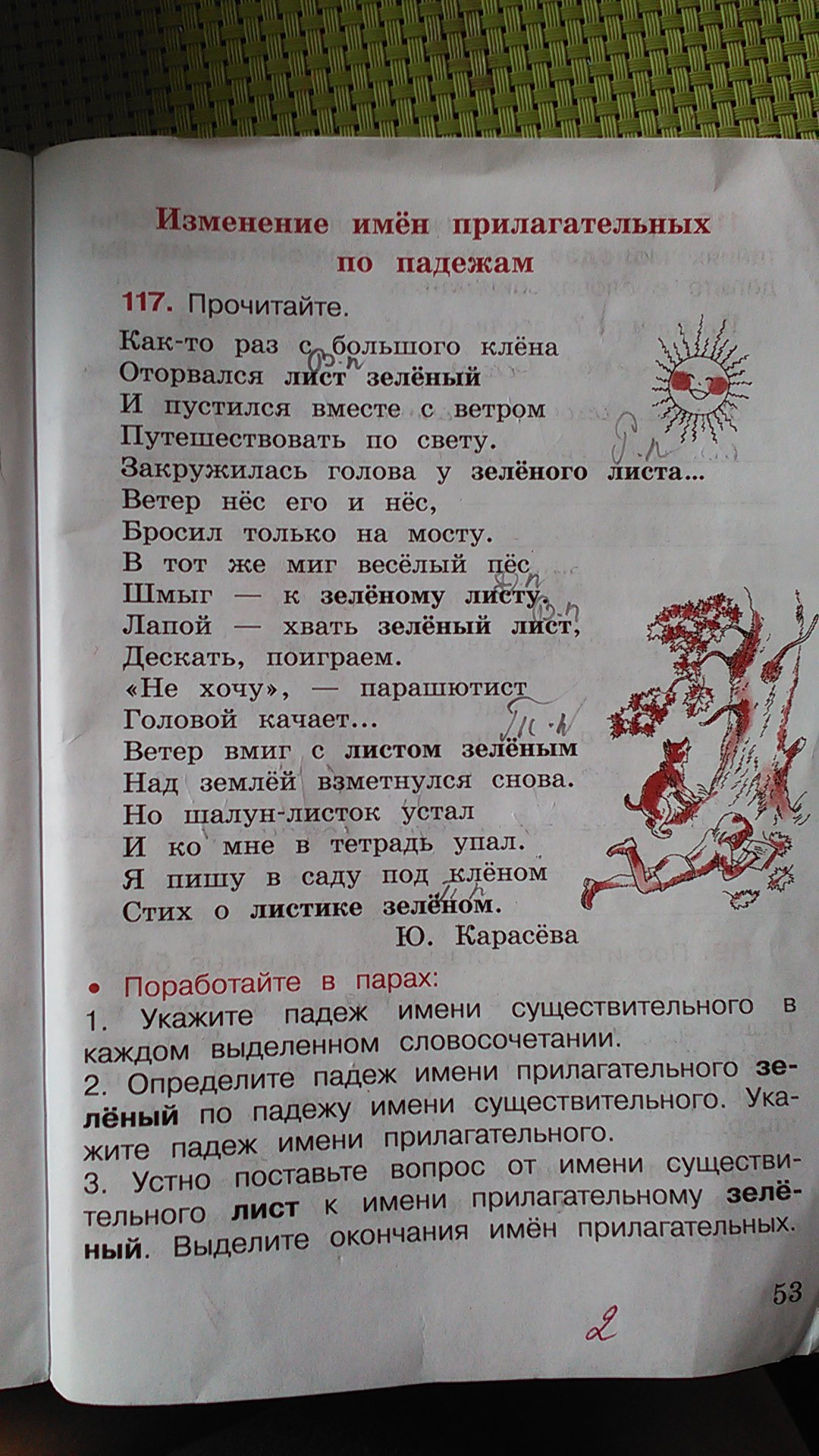 лист (какои?) зеленыи. у листа (какого?) зеленого. к листу (какому?) зеленому. лист (какои?) зеленыи. с листом (каким?) зеленым. о листике (каком?) зеленом.