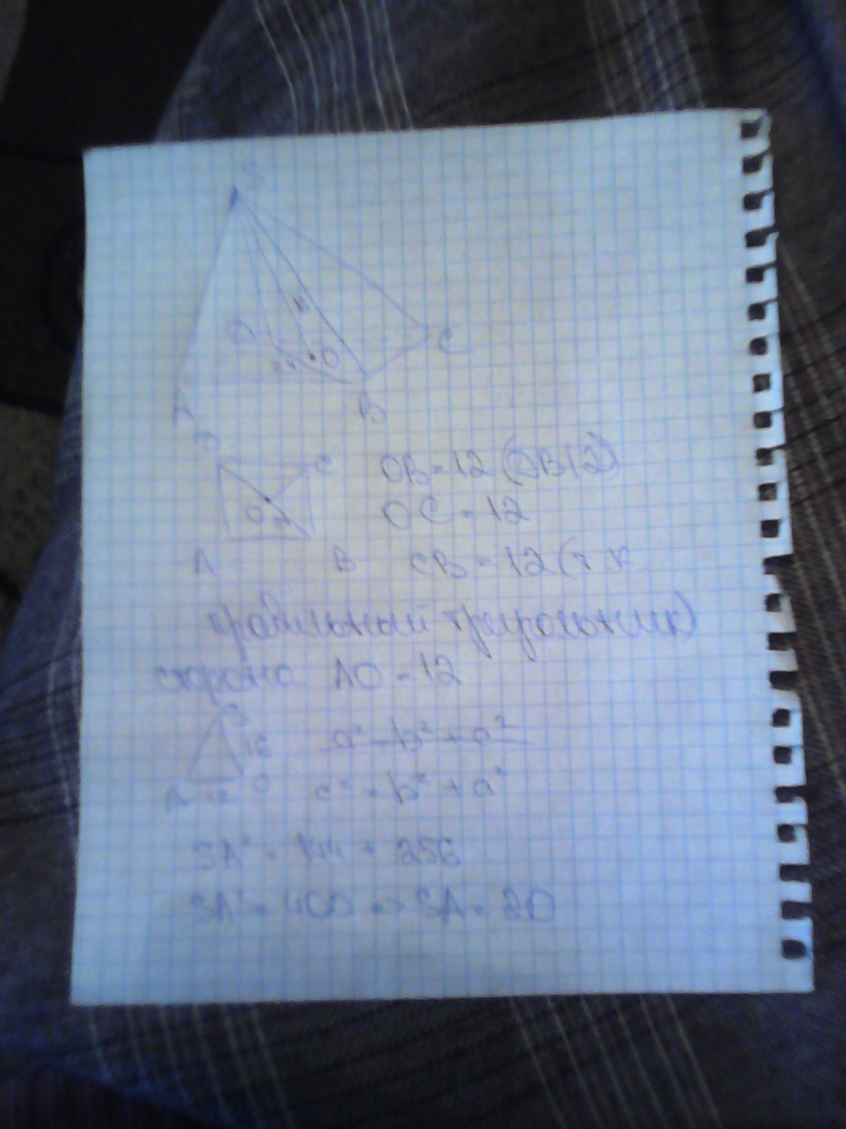 В правильной четырёхугольной пирамиде SABCD точка О-центр основания, S-вершина, SO=16. BD=24. Найдите боковое ребро