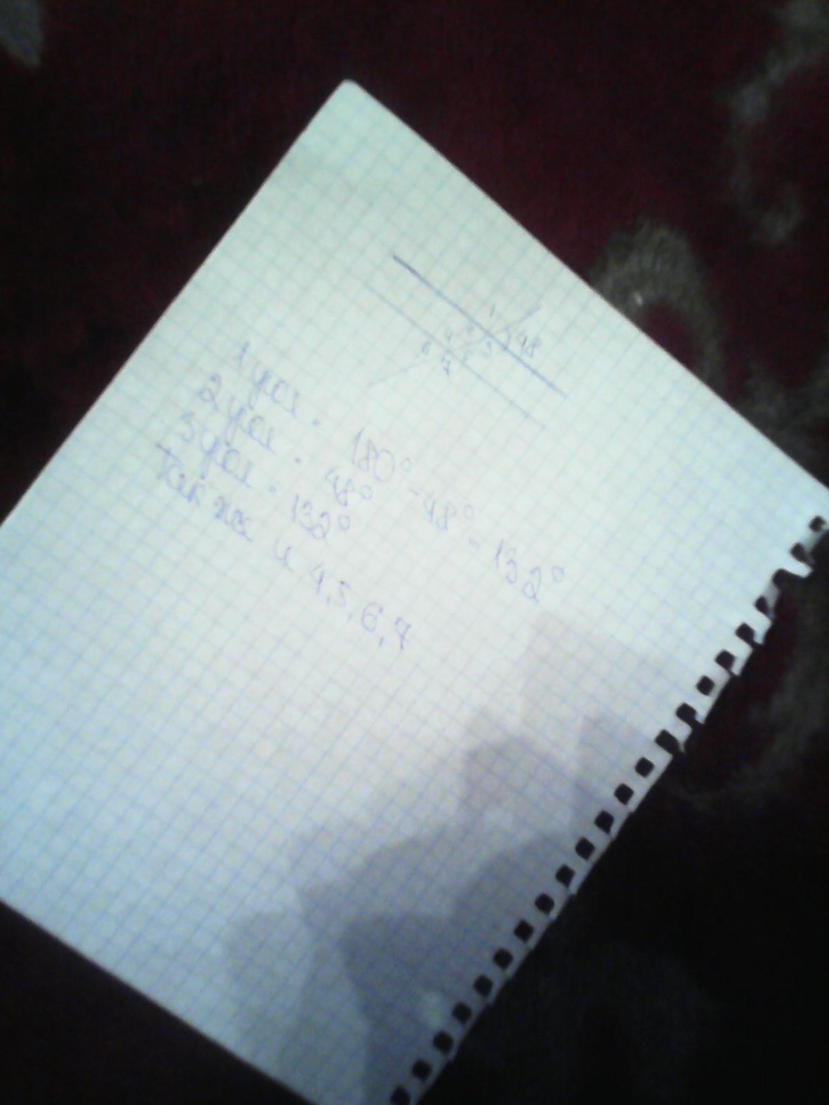 один из углов полученных при пересечении двух параллельных прямых секущей равен 48 найдите остальные 7 углов