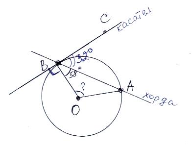 Угол между хордой AB и касательной BC равен 32 градуса. Найдите величину меньшей дуги,стягиваемой хордой AB.