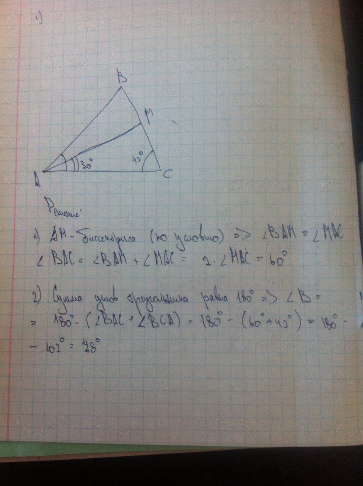 В тееугольнике АВС проведена биссектриса АМ,угол МАС =30 градусов,угод С равен 42 градусам Найдите угол В