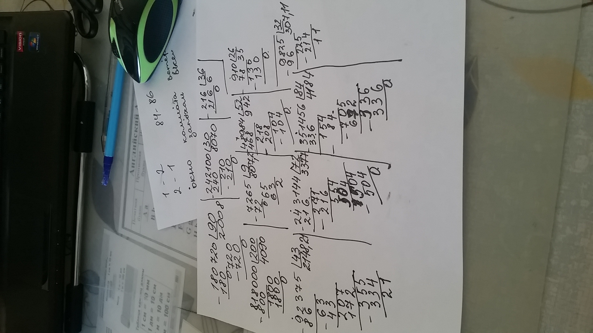 деление столбиком по шаговоя 180720:90=; 242100:30=; 818000:200=; 7265:9=; 48984:52=; 92375:43=; 243144:72=; 351456:84=; 9825:32=; 216:36=; 910:26=; 3•у+1