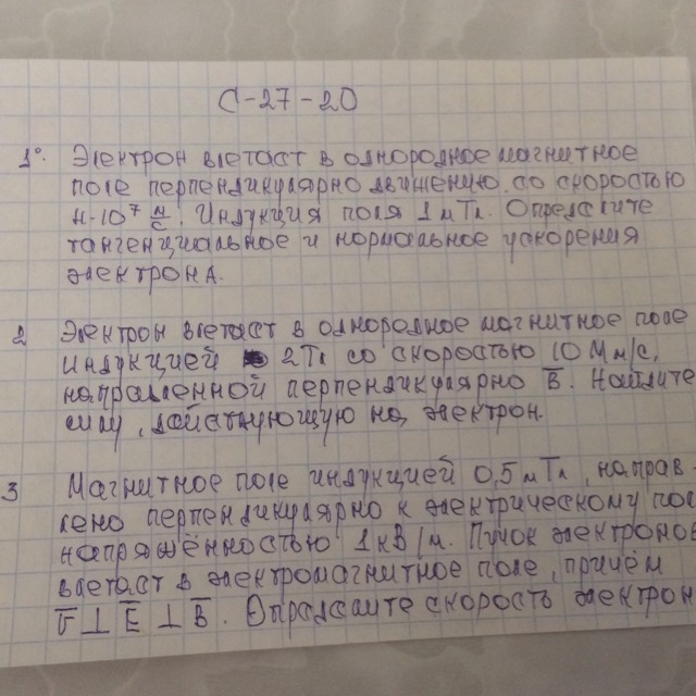 2)Электрон влетает в однородное магнитное поле с индукцией 2 Тл со скоростью 10М м/с, направленной перпендикулярно вектор в . Найдите силу действующую на электрон.
