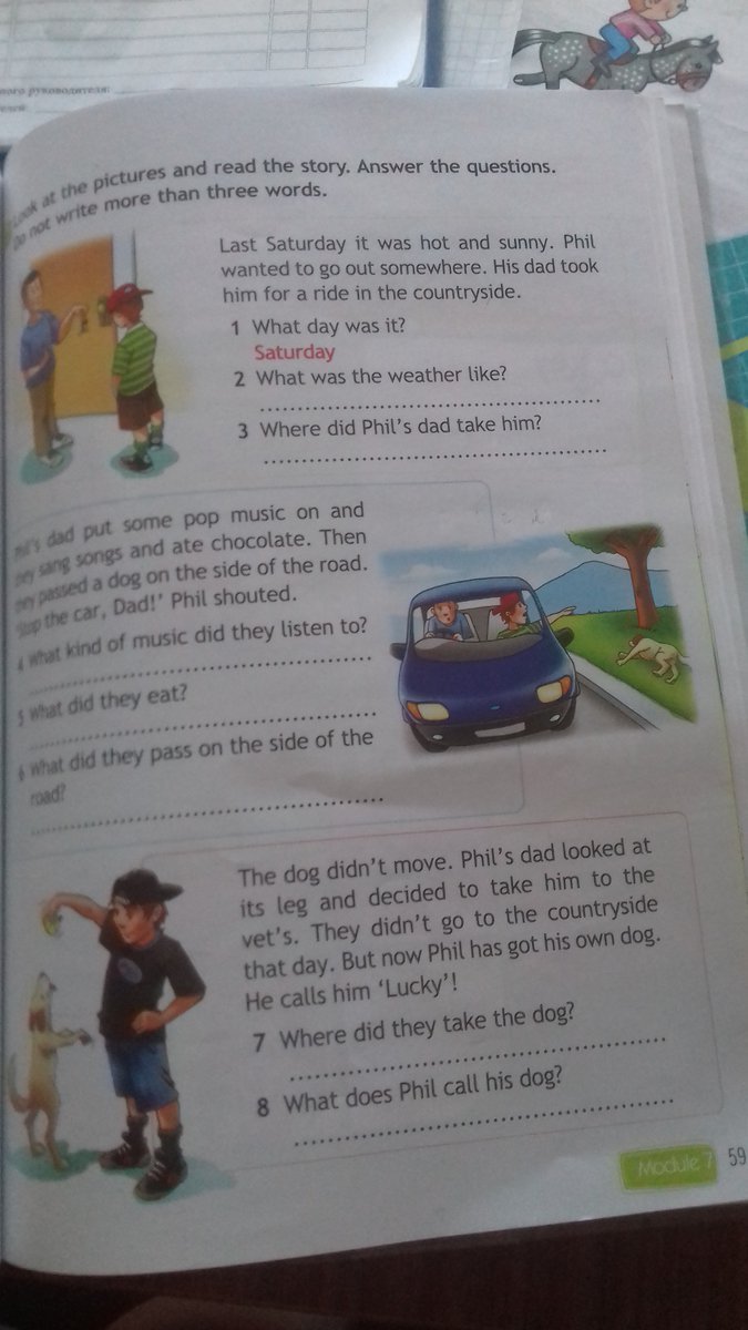 2. hot and sunny 3. for a ride in the contryside 4. pop music 5. chocolate 6. a dog 7. to the vet's 8. Lucky