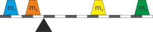 Дан невесомый рычаг с двумя противовесами на каждой стороне. Массы противовесов m1=7 кг, m2=123 кг и m3=18 кг. Какова масса противовеса m4, если рычаг находится в равновесии?
