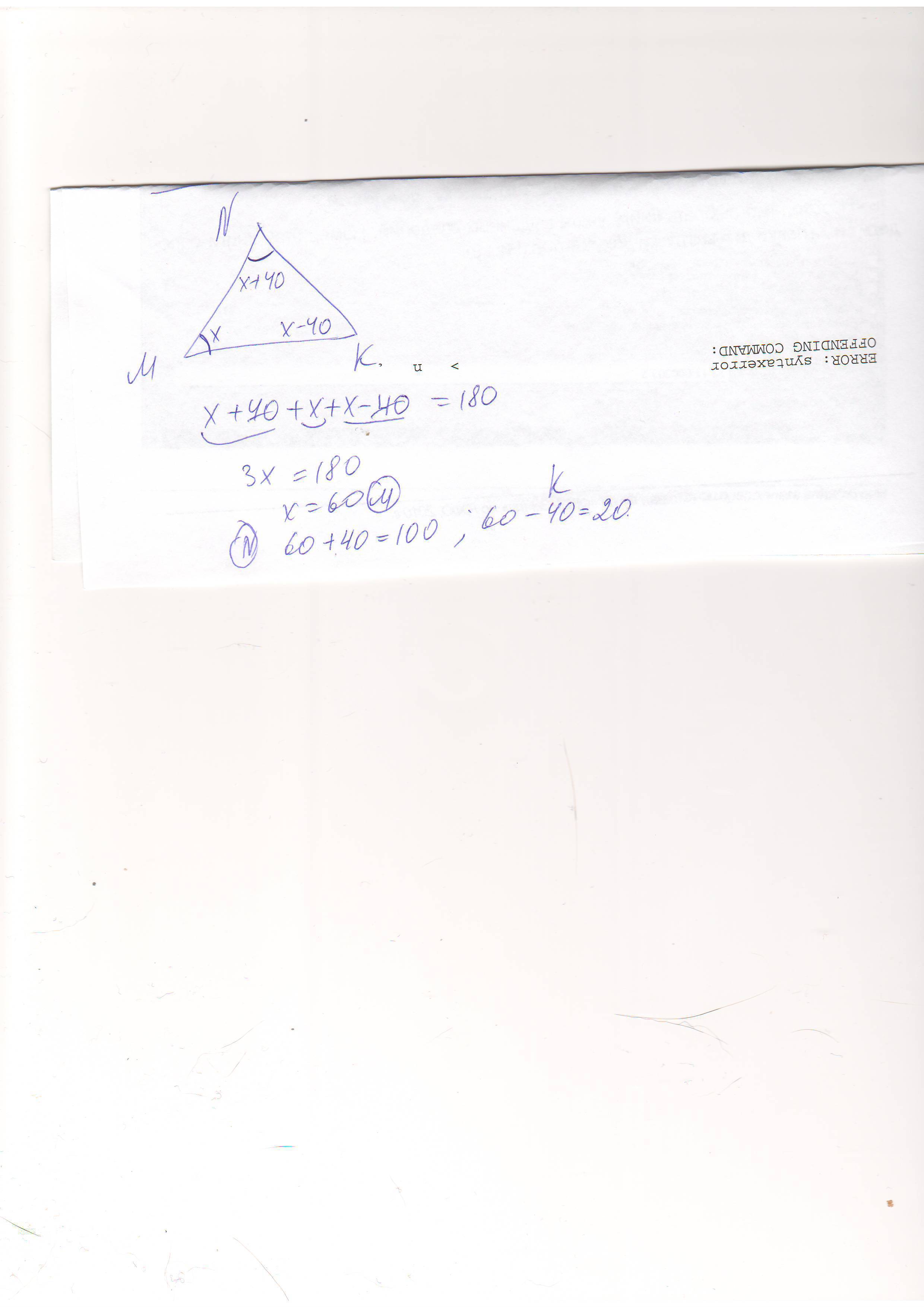 Найдите градусные меры углов треугольника МNK,если угол M меньше угла N на 40 градусов и больше угла K на 10 градусов.Даю 40 баллов