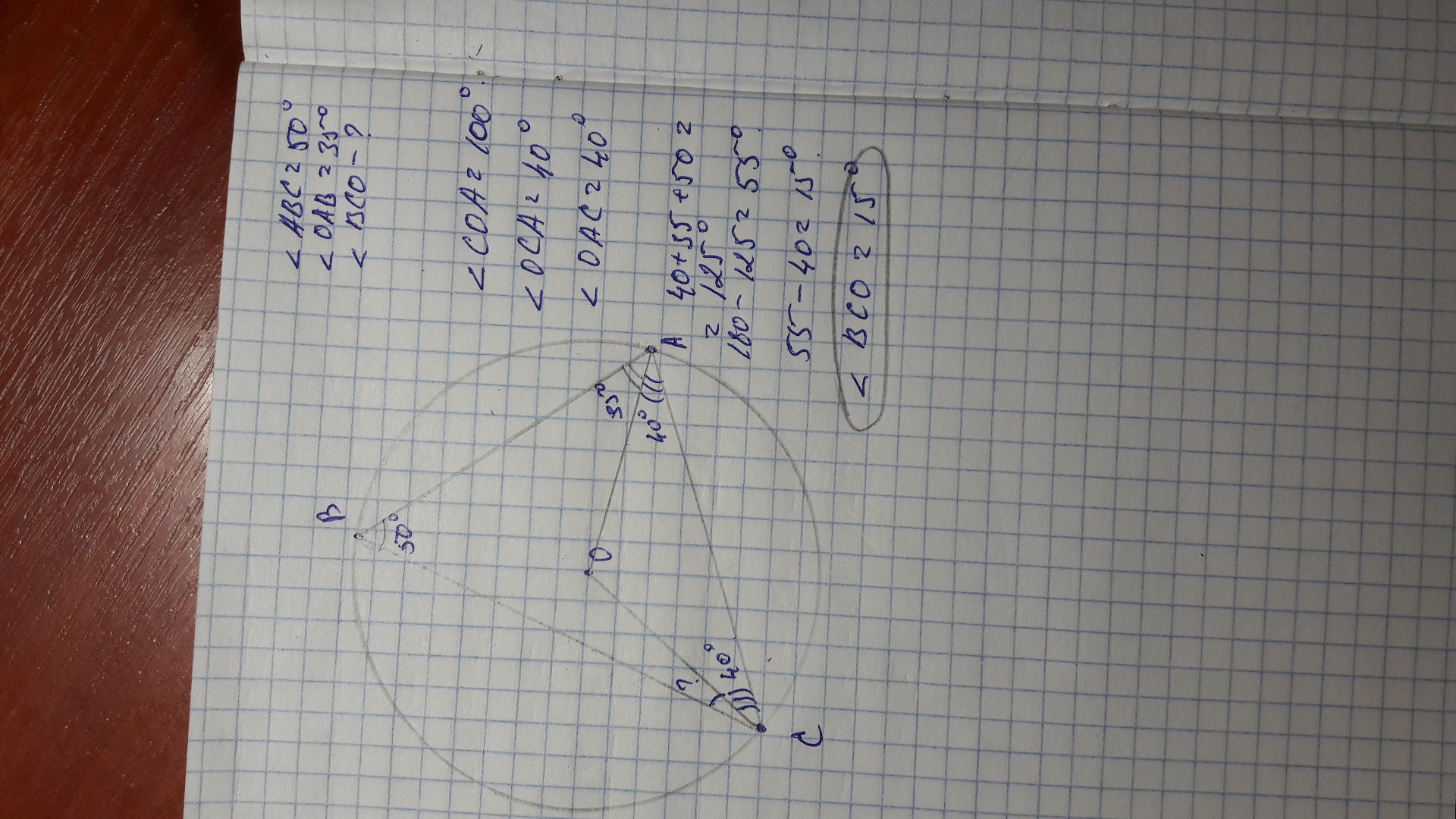 точка O - центр окружности, на которой лежат точки A, B и C. Известно, что угол ABC=50° и угол OAB=35°.Найдите угол BCO. Ответ дайте в градусах