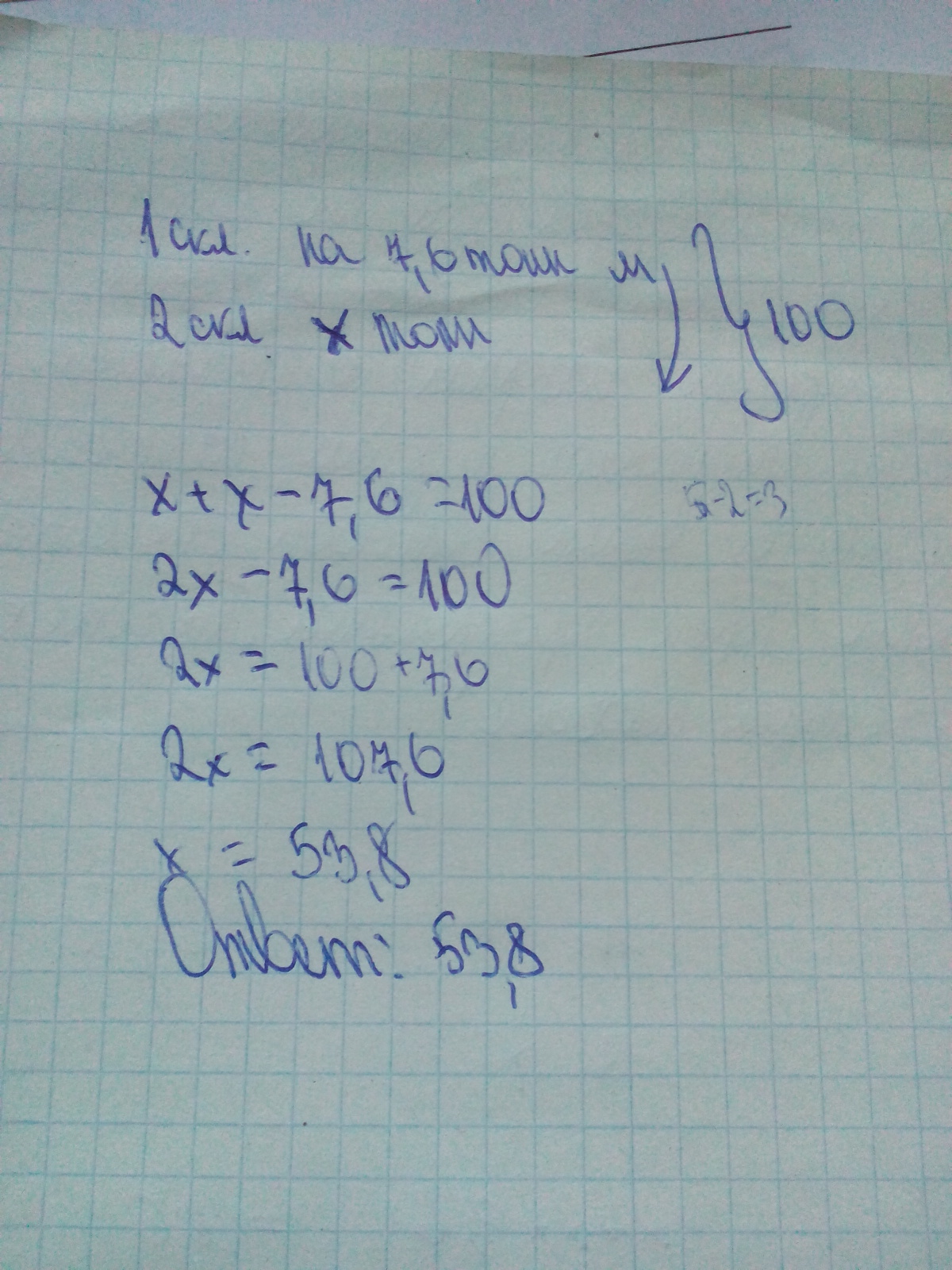 На первом складе на 7,6 тонн угля меньше, чем на втором, а на двух складах вместе 100 тонн угля. Сколько тонн угля на 2-ом складе? Решительно арефметическим и алгебраическим способом ЗАРАНЕЕ БОЛЬШОЕ СПАСИБО!!!