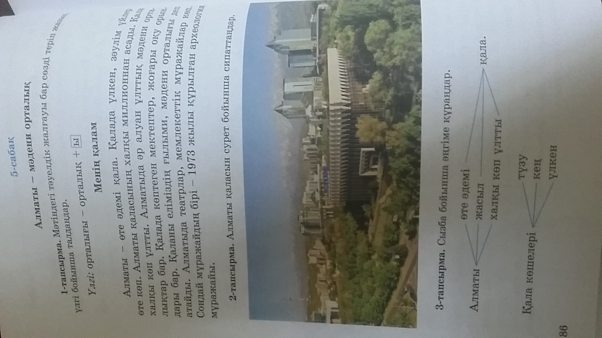 Алматы -Қазақстанның ең сұлу қаласы.Ол Алатаудың етегінде орналасқан.Алматыда үлкен биік-биік үйлер көп.Қалада көптеген мектептер, театрлар,мемлекеттік мұражайлар бар.Алматы жасыл қала.