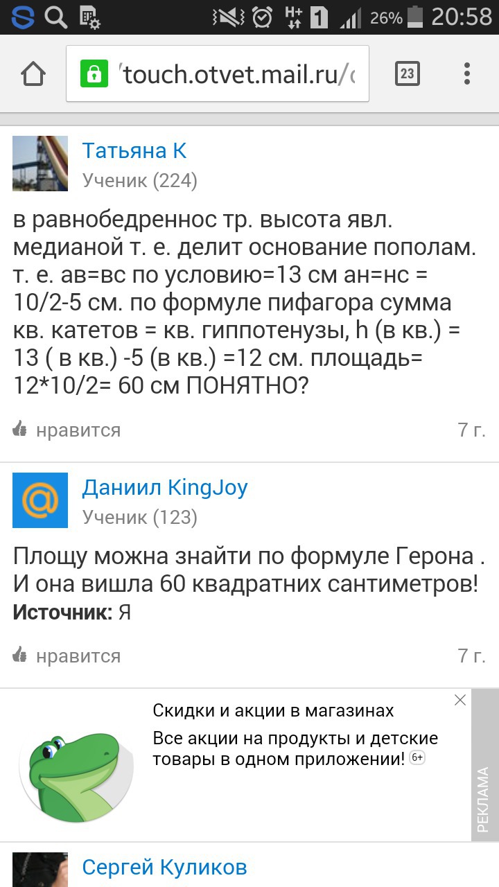 2)Найдите площадь равнобедренного треугольника , если его основание равно 10 см , а боковая сторона равна 13 см