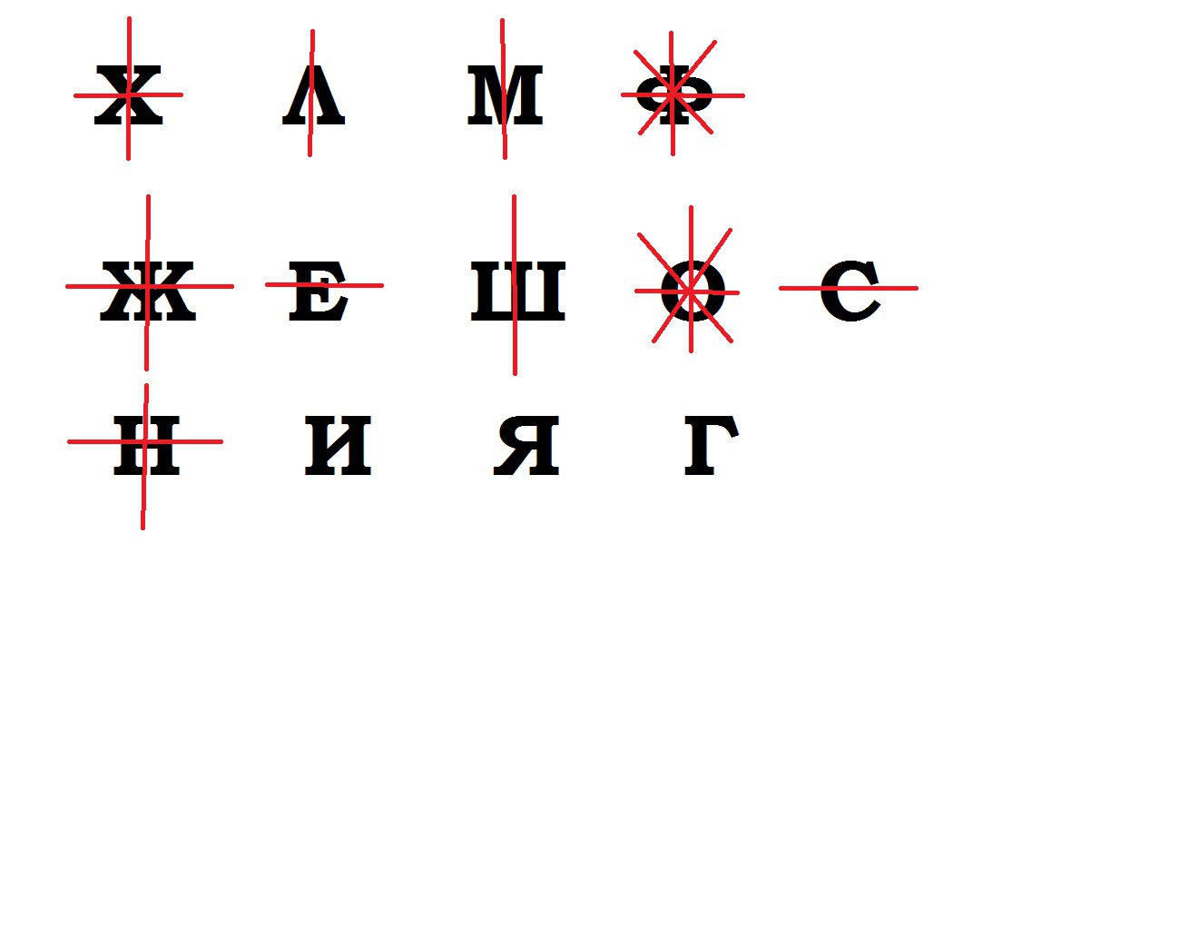 Уважаемые друзья помогите пожалуйста ,правильно расставить буквы . Буквы Ж,Н,Ш,О,Х, -должны стоять только в каком то одном месте .(понятно ,что у них и вертикальная и горизонтальная асиметрия