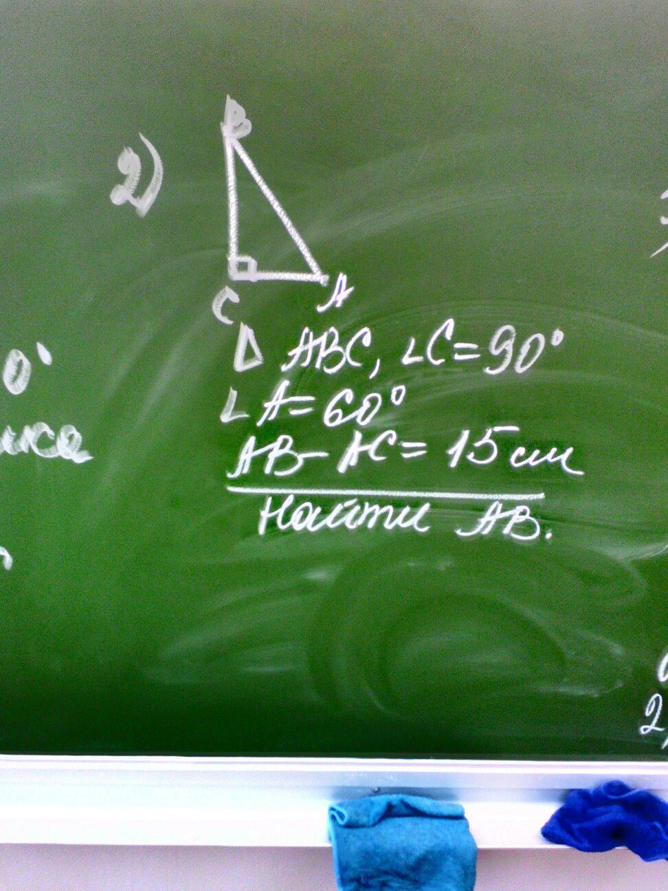 90-60=30 градусов против угла в 30 градусов катит равен половине гипотинузы 15+15=30см