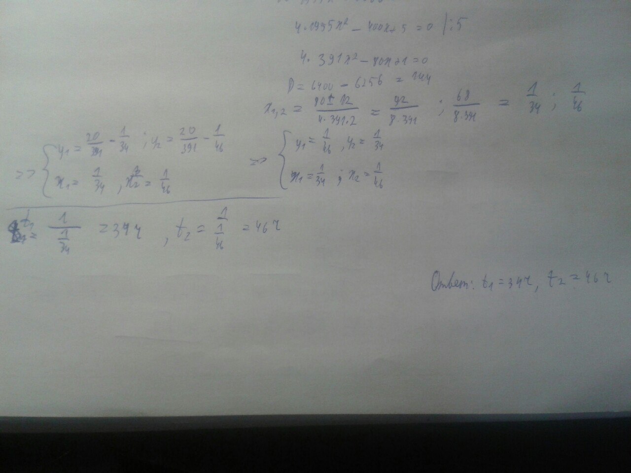 Составляем систему уравнений: первое уравнение : (1/x)+(1/y)=20 ; второе: 1/(x+y)=4.8