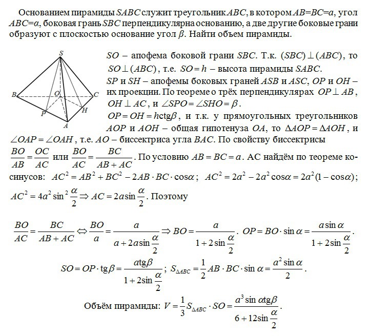 основание пирамиды sabc служит треугольник abc в котором ab=bc=a уголABC=альфа боковая грань sbc перпендикулярна основанию а две другие боковые грани образуют с плоскостью основание угол бетта найти объем пирамиды