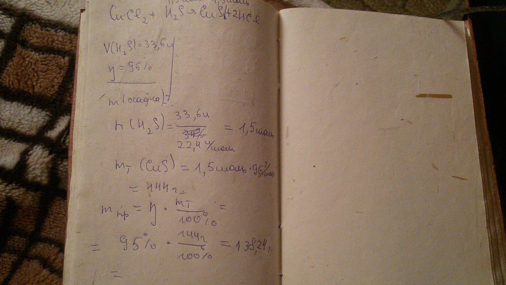 Определитель массу осадка, который образовался при взаимодействии хлорида меди (||) и сероводорода объёмом 33,6 л, если массовая доля выхода осадка равна 95%.
