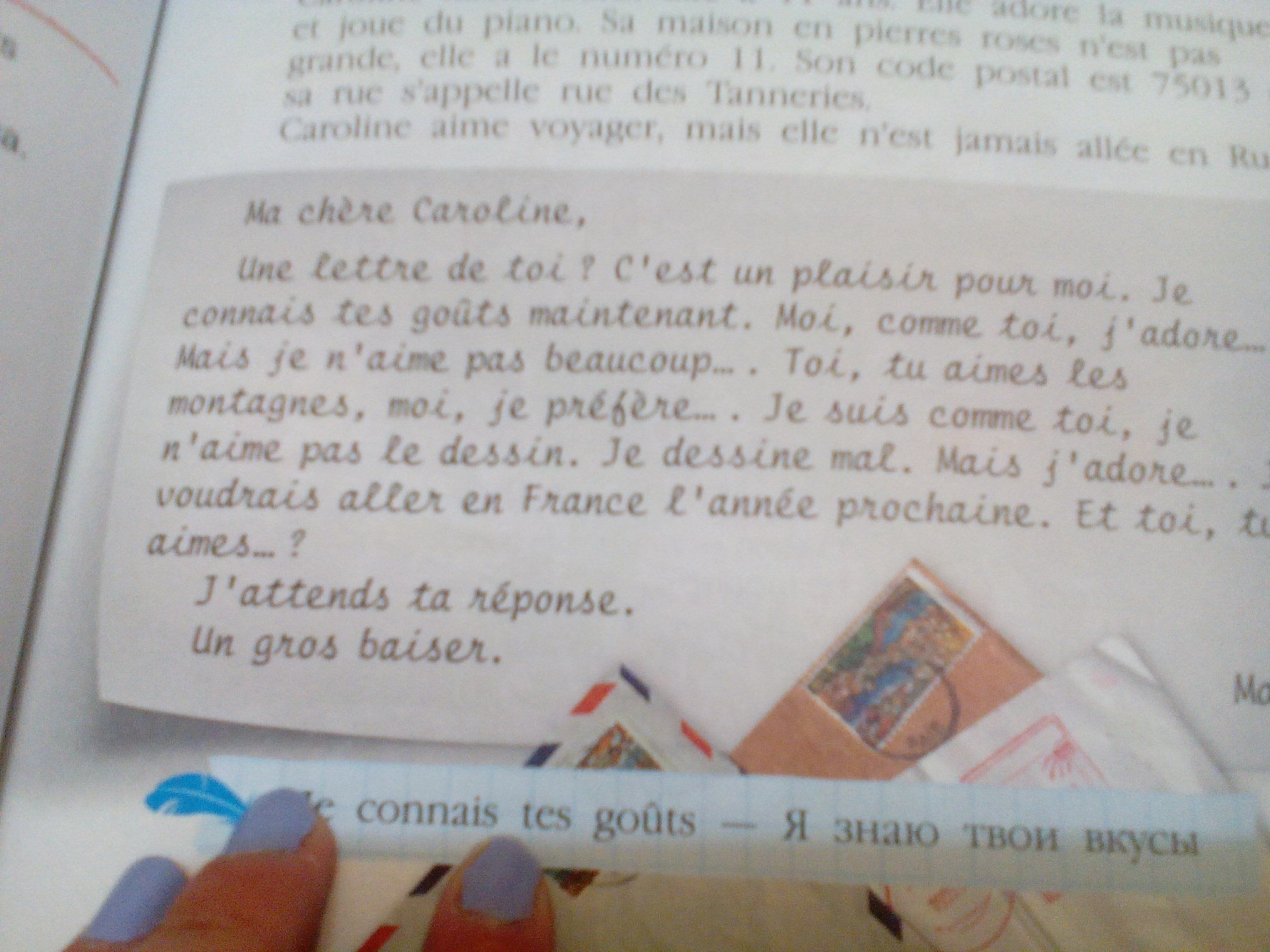 Моя дорогая Каролина! Письмо от тебя? Это удовольствие для меня. Теперь я знаю твои вкусы. Я, как и ты, обожаю .... Но я очень не люблю ....