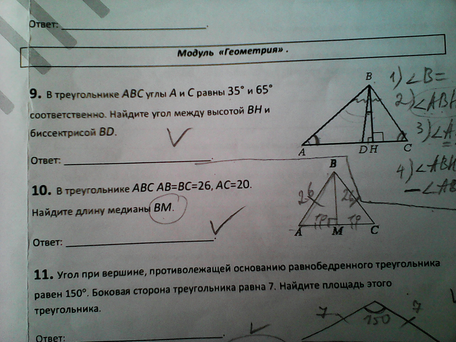 Сперва находим ŁABC; он равен 80°, а бисектрисса поделит его на углы 40° и 40°. Находим угол ABH: 180° - 35° - 90° = 55°