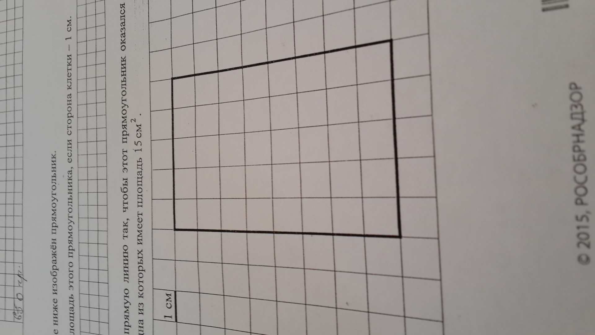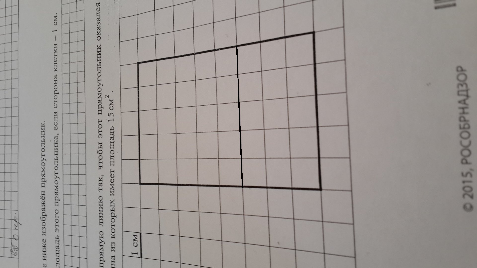 найди площадь этого прямоугольника ,если сторона клетки 1 см.проведи прямую линию так,чтобы этот прямоугольник оказался разбит на две части ,одна из которых имеет площадь 15 см в квадрате