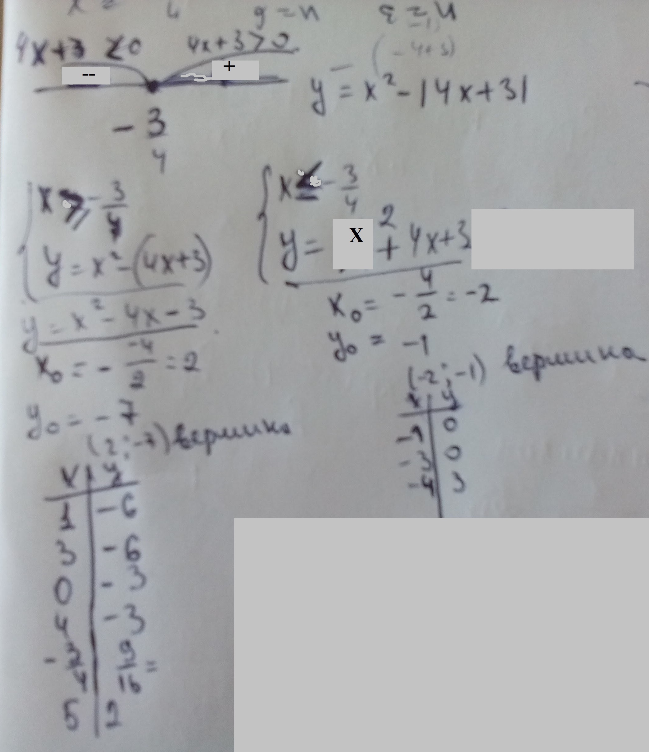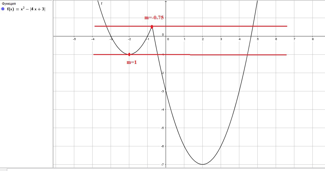 Постройте график функцииУ=х^2-|4х+3| и определите,при каких значениях m прямая у=m имеет с графиком ровно три общие точки