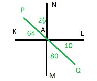 Прямые KL, MN и PQ пересекаются в точке А, угл KAM=90, угл КАР: MAQ=4 : 5. Один из образованныхуглов равен 80 гр, два другие относятся как 2 : 3. Найдите наименьший из углов : РAN, LAN и LAQ.