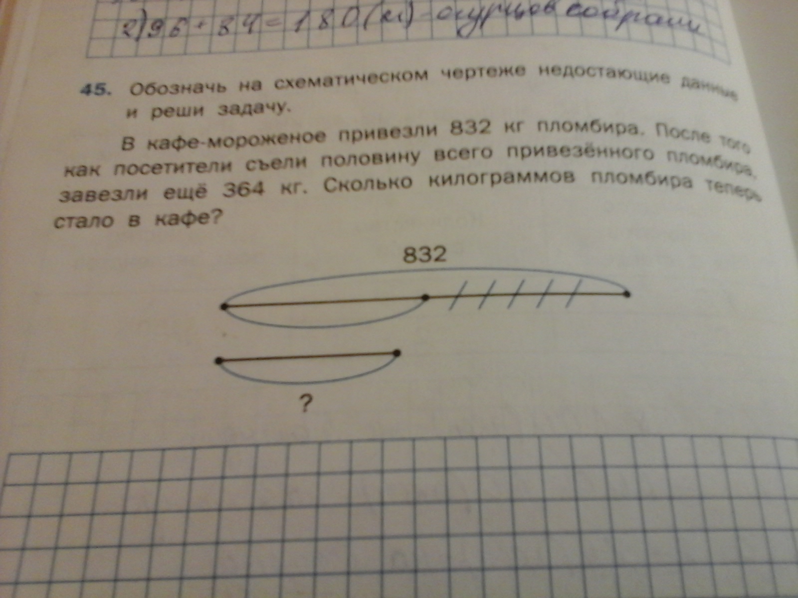 в кафе - мороженое привезли 832 кг пломбира . После того как посетители съели половину всего привезённого пломбира, завезли ещё 364 кг . сколько килограммов пломбира теперь стало в кафе ?