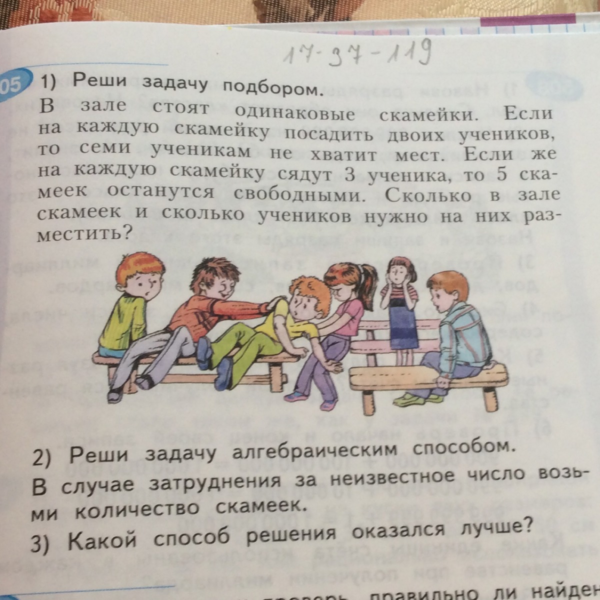 2 способ: х2+7=х3-5 3х+42=2х-30 х= 72 скамейки