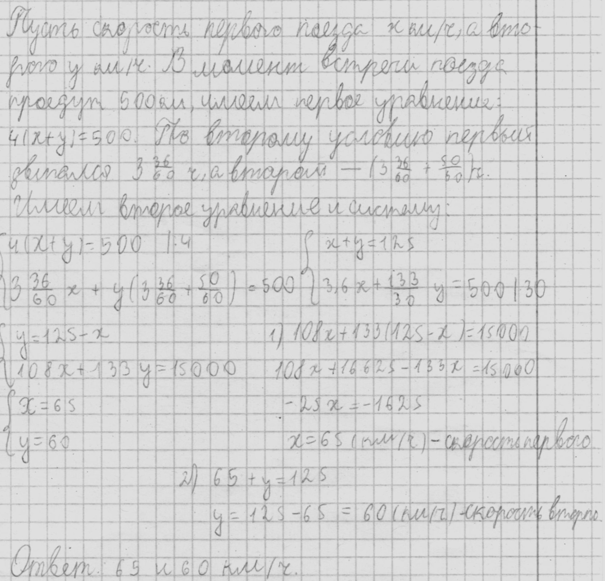 Из двух городов, расстояние между которыми 500 км, выехали одновременно два поезда и встретились через 4 ч. Если бы второй поезд выехал на 50 мин раньше первого, то они встретились бы через 3 ч 36 мин. Найдите скорость каждого поезда.