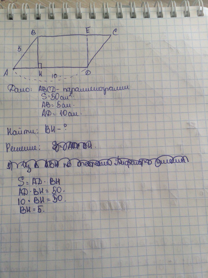 Пожалуйста,помогите!Даю 15 баллов!Площадь параллелограмма 50 см².Две его стороны равны 5 и 10 см.Найти высоту параллелограмма.Пожалуйста,с чертежом!