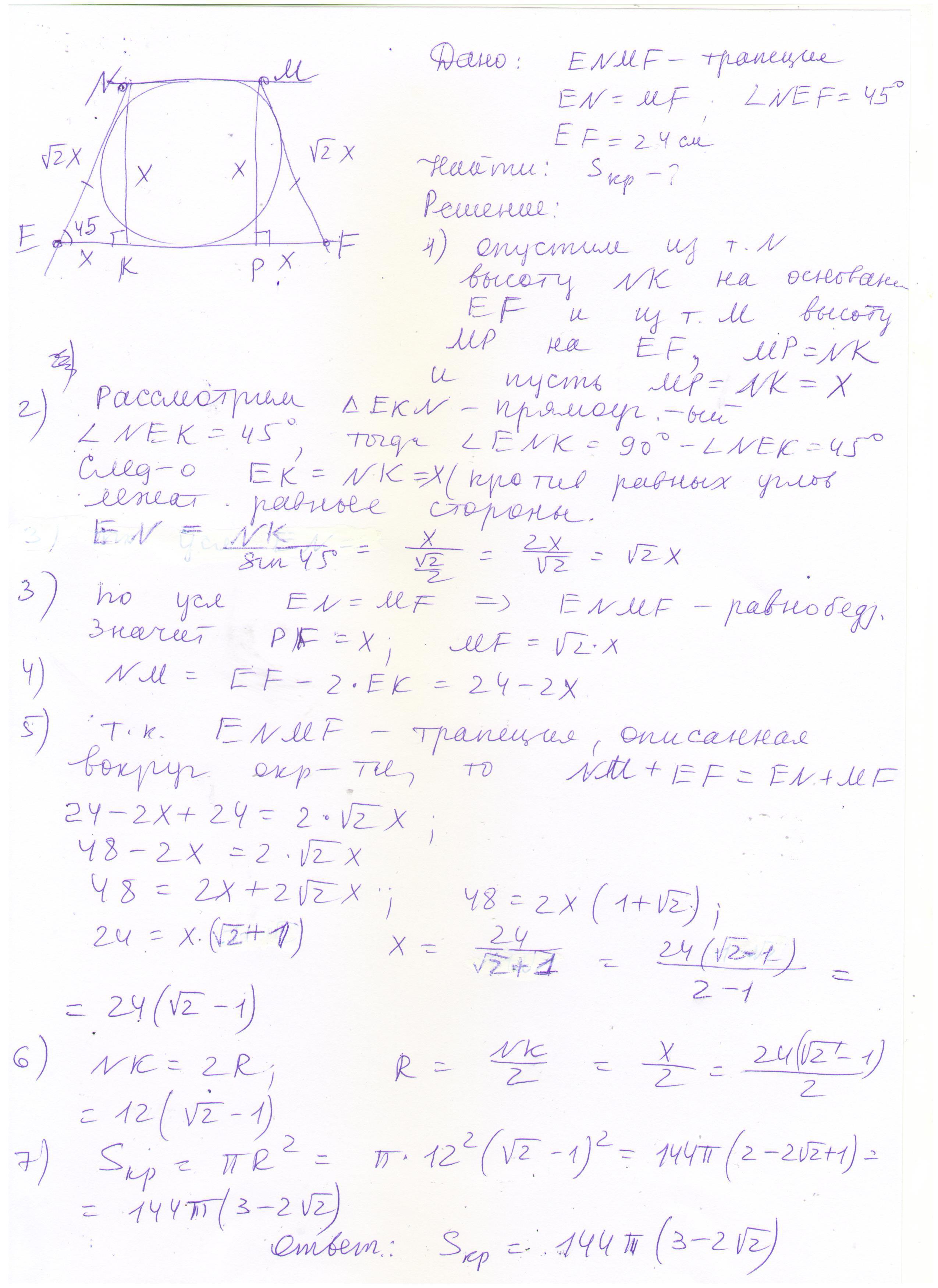 В трапецию ENMF вписана окружность. EN=FM. УголNEF равен 45. Большее основание 24 см. Найти площадь круга. Помогите пожалуйста.