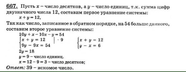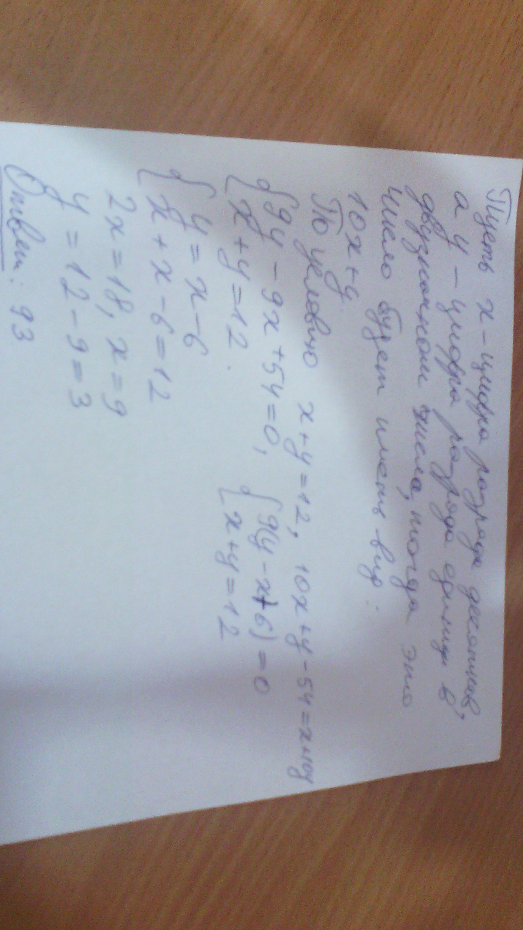 Сумма цифр двузначного числа равна 12. Число, записанное теми же уифрами, но в обратном порядке, на 54 больше данного числа. Обьясните подробно откуда в г_д_з взялось " 10y+x-10x-y=54 "?