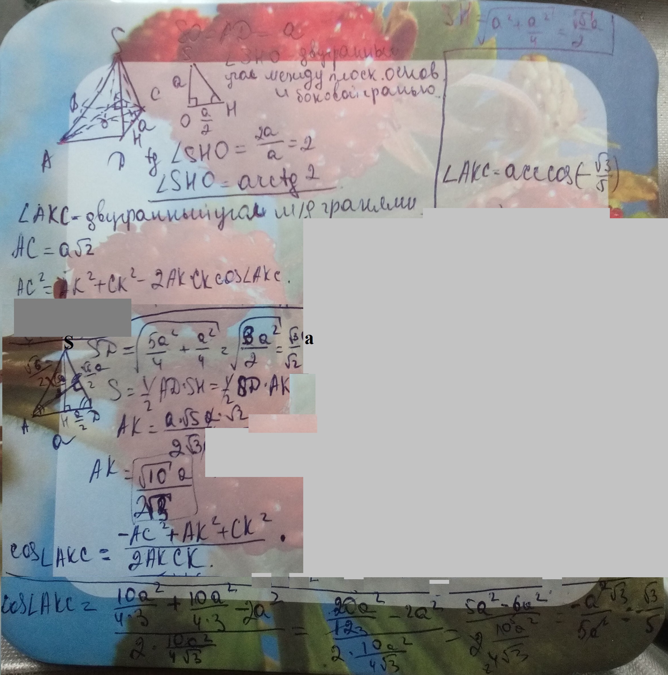 В правильной четырехугольной пирамиде сторона основания равна a,высота-a.Найдите двугранный угол между плоскостью основания и боковой гранью,а также двугранный угол между смежными боковыми гранями.