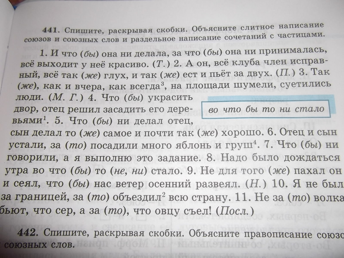1)И что бы она ни делала, за что бы она ни принималась все выходит у неё красиво. (частицы "бы" пишутся отдельно, так как их можно не употреблять, и смысл предложения не изменитя). 2) А он, все клуба член исправный, всё также глух, и также ест и пьет за двух. (также пишется слитно, так как упротребляется в значении тоже, без частицы "же" смысл теряется). 3) Так же, как и вчера (так же, как и - устойчивый оборот, где же пишется раздельно, если её не писать то смысл предложения не меняется, следовательно "же" пишется отдельно)........4) Чтобы (пишется слитно можно заменитьна "для того, чтобы" без "бы" смысл теряется поэтому пишется слитно). 5) Что бы ни делал ( в данном случае без "бы" смысл не теряется поэтому пишется раздельно). 6) Отец и сын устали, зато (пишется слитно так как без "то" потеряется смысл предложения) 7) Что бы ни говорили (без "бы смысл не теряется пишется раздельно) 8) во что бы то ни стало - устойчивый оборот, в котором все слова пишутся раздельно друг от друга 9) Не для того же пахал он ( без "же" смысл не изменится, пишем раздельно) и сеял, чтобы (пишется слитно без "бы" потеря смысла предложения) нас ветер..... 10) зато (в этом предложении пишется слитно, без "то "смысл теряется) 11) Не за то волка бьют ( раздельно так как то в данном случае союзное слово а отдельное местоимение) а за то, что....