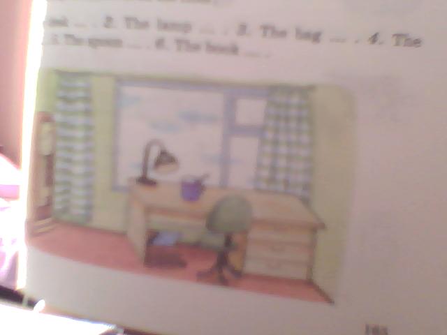 The desk on a floor. The lamp on a desk . The bag next to desk . The mug on a desk . The spoon in mug . The book ..... (книгу я на картинке не увидела.)
