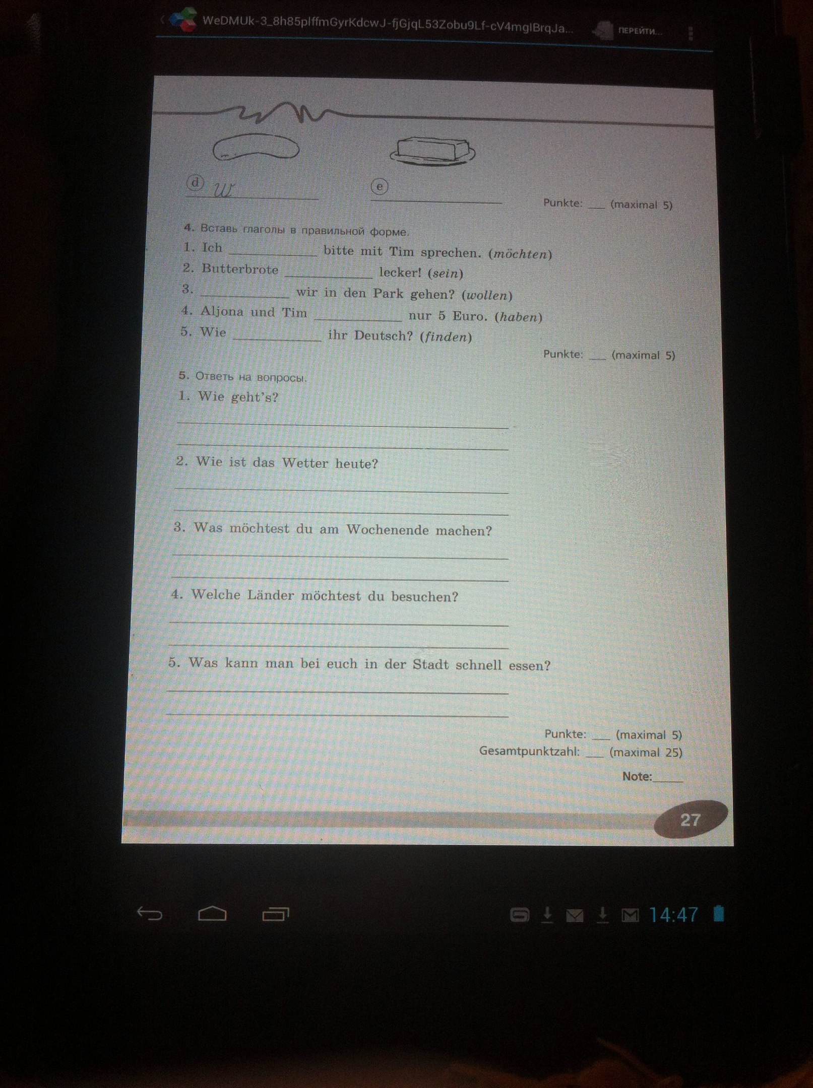 Ich möchte bitte mit Tim sprechen. Butterbrote sind lecker. Wollen wir in den Park gehen? Aljona und Tim haben nur 5 Euro. Wie findet ihr Deutsch?