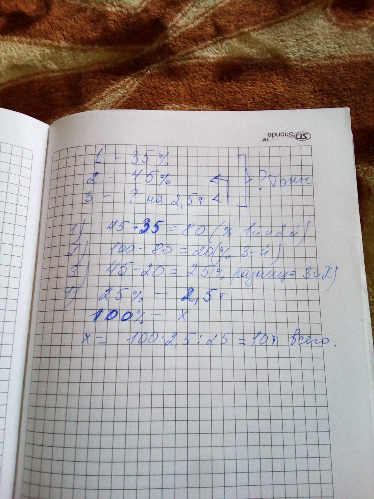 с поля кукурузу увезли в 3 грузовиках.на первый погрузили 35%всей кукурузы.на второй 45% всей кукурузы. а на третий на 2,5 тонн меньше,чем на второй.сколько тонн кукурузы всего погрузили на три грузовика