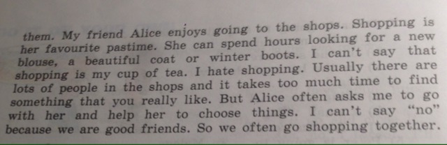 Моя подруга Алиса любит ходить по магазинам. Шопинг ее любимое занятие. Она может проводить время рассматривая новую блузку красивое пальто или зимние ботинки.