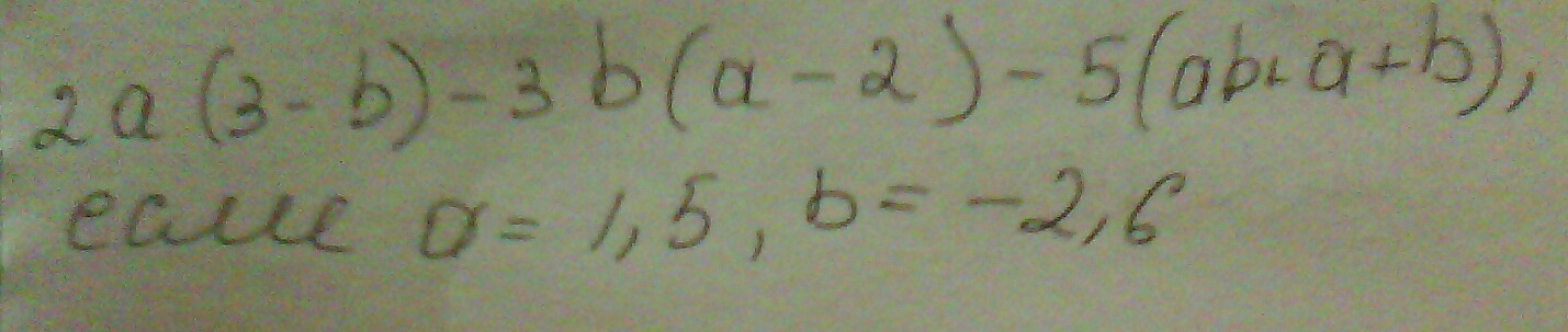 2a(3-b) - 3b(a-2) - 5(ab+a+b) = 6a - 2ab - 3ab +6b - 5ab - 5a -5b = a+b - 10ab = 1,5 - 2,6 + 10*1,5*2,6 = - 1,1 +39 = 37,9