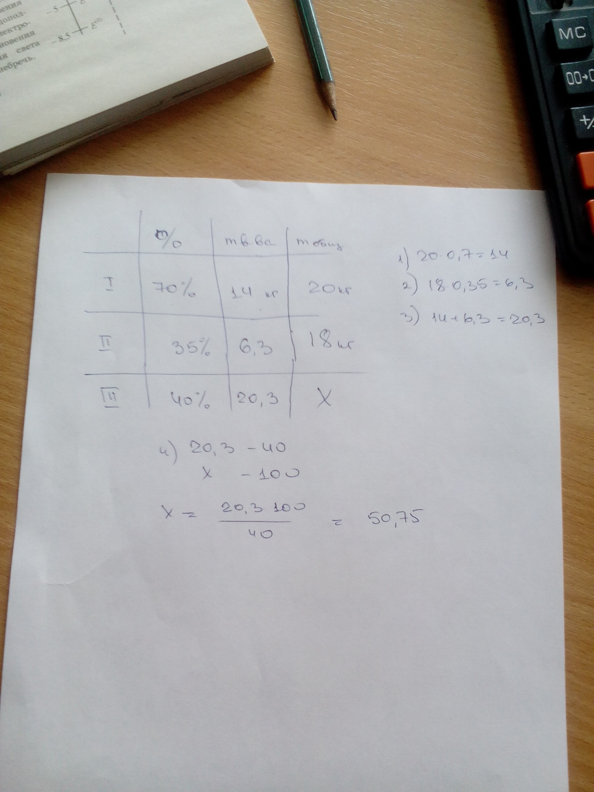Мешали 20 кг 70%-го раствора кислоты и 18 кг 35%-го раствора той же кислоты. Сколько килограммов воды необходимо добавить к полученному раствору, что бы его концентрация стала равна 40%