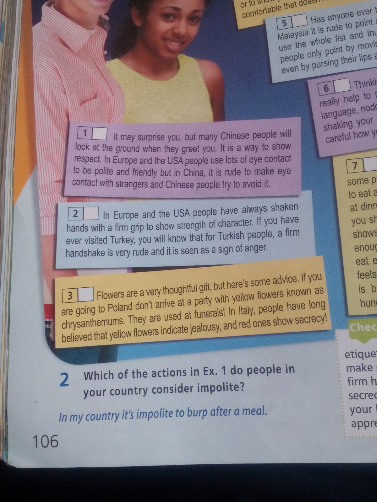 1)Это может удивить вас, но многие китайские люди будут смотреть на землю , когда они приветствуют вас . Это способ проявить уважение . в Европе и США люди используют много зрительный контакт , чтобы быть вежливым и дружелюбным , но в Китае это грубо , чтобы сделать зрительный контакт с незнакомыми людьми и китайского народа стараются избегать его
