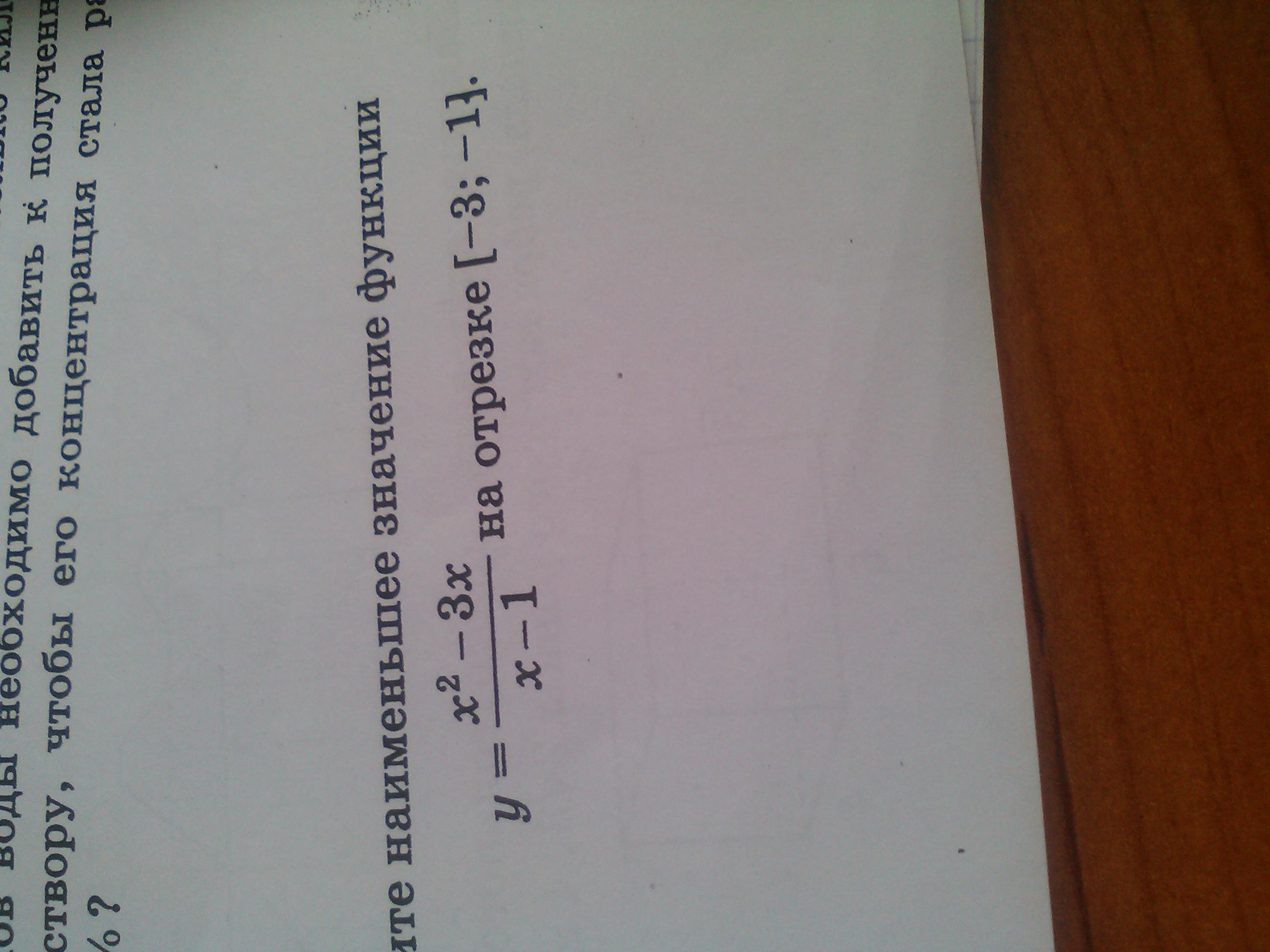 Производная функции y'=(x²-2*x+3)/(x-1)² в нуль не обращается, так как её числитель x²-2*x+3=(x-1)²+2>0 при любых значениях х, а знаменатель положителен при всех значениях х, кроме значения х=1. Но при х=1 функция не определена. На интервале x∈[-3;-1] y'>0, поэтому на этом интервале функция монотонно возрастает. Значит, наименьшее значение функция принимает при х=-3 и оно равно ((-3)²-3*(-3))/(-3-1)=18/(-4)=-4,5. Ответ: -4,5.