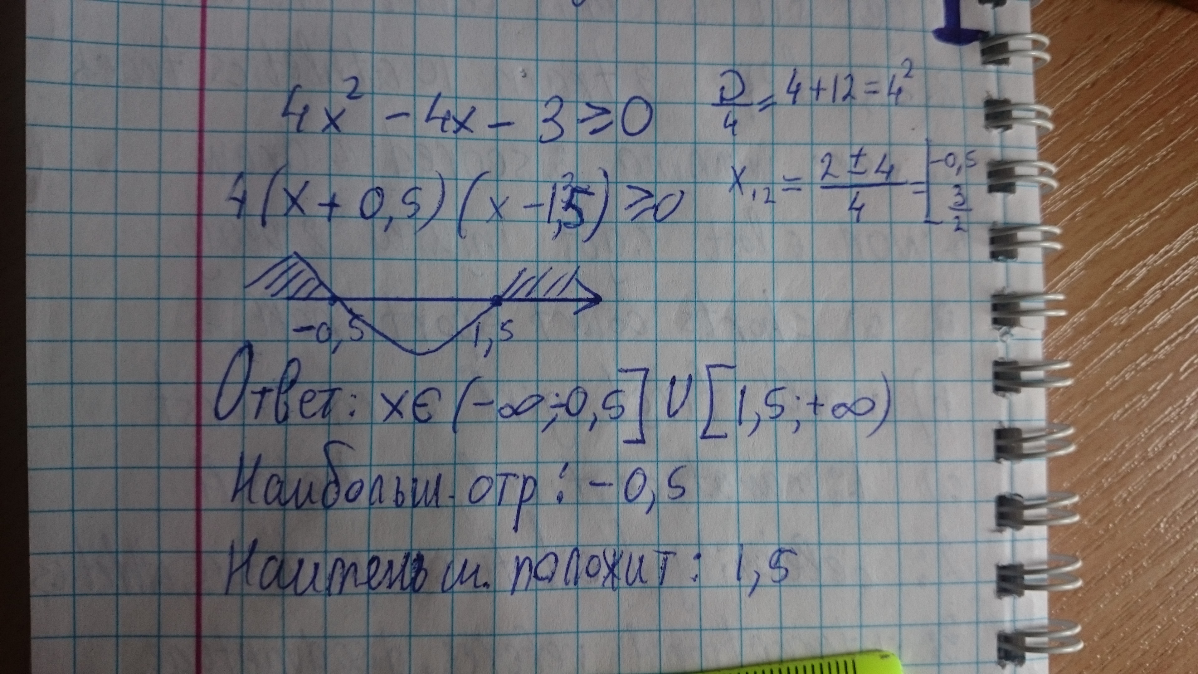 Решите неравенство 4x^2-4x-3=>0 и найдите его наибольшее отрицательное и наименьшее положительное целое решение.