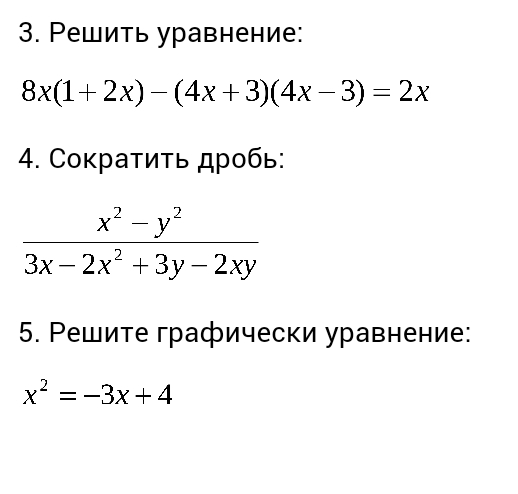 3. 8х(1+2х)-(4х+3)(4х-3)=2х; 8х+16х²-16х²+9-2х=0; 6х=-9; х=-9:6=-1,5......4.сам пример не пишу,ставлю=числитель: (х-у)(х+у)/ знаменатель:3(х+у)-2х(х+у)=числитель:(х-у)(х+у)/знаменатель:(х+у)(3-2х)=числит: х-у/знаменатель:3-2х...........5. х²=-3х+4; у=х²-это парабола ветви вверх; у=-3х+4-это прямая,задаем координаты для построения: х=0,у=4;х=1,у=1( прямая пересекается с параболой в двух точках,А(-3;9);В(1;1)ответ:х1=-3;х2=1
