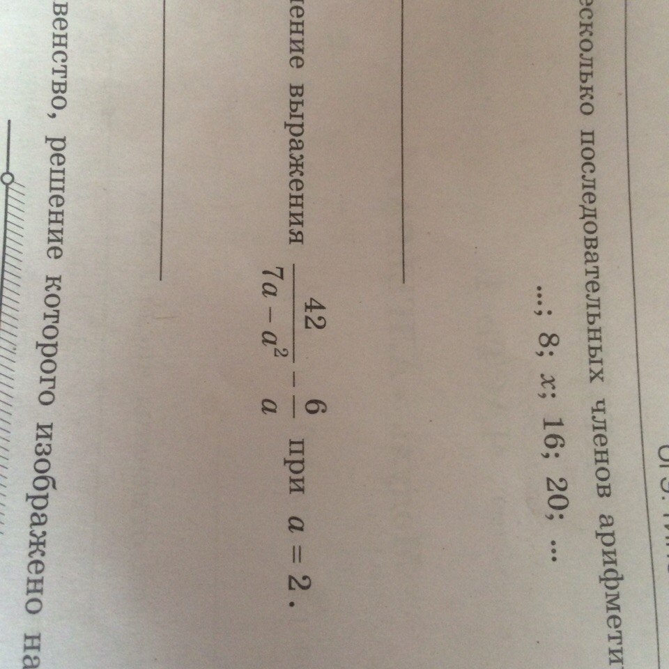 42/7а-а² - 6/а=42/а(7-а) - 6/а=числитель: 42-6(7-а)/знаменатель: а(7-а)=числит: 42-42+6а/ знамен: а(7-а)=6/(7-а)=6/(7-2)=6/5=1,2