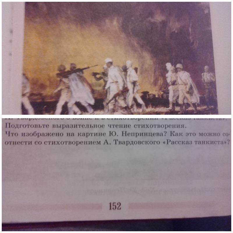 2)На этой картине изображена горящая степь.На заднем плане атакуют танки.В этом стихе есть строки "Душила гарь и копоть.От дома к дому шел большой пожар".С этими строками можно соотнести эту картину.