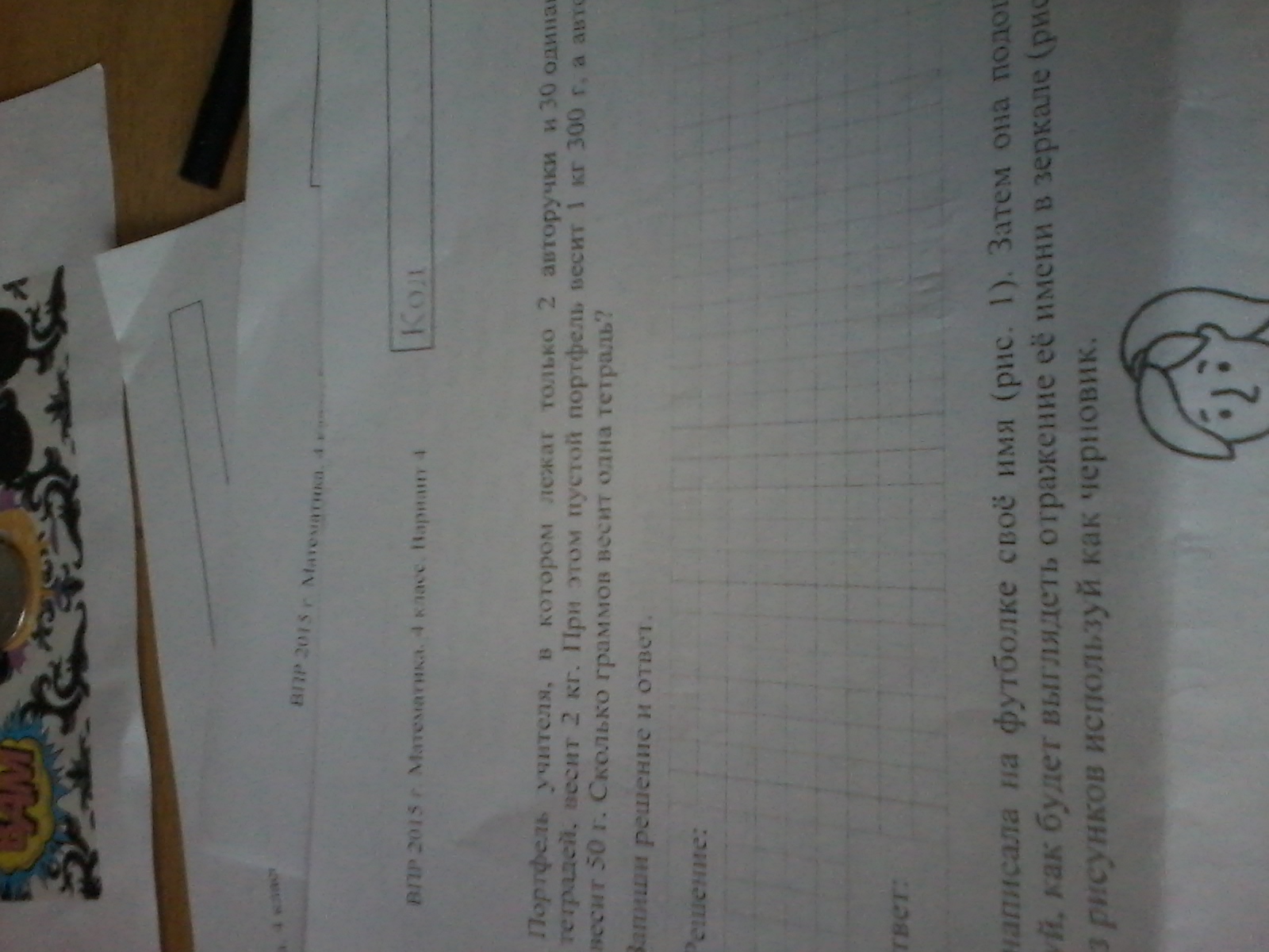 портфель учителя в котором лежат только две авторучки 30 новых тетради весит 2 килограмм при этом пустой портфель весит 1 килограмм 300 грамм авторучка весит 50 грамм. Сколько граммов весит одна тетрадь