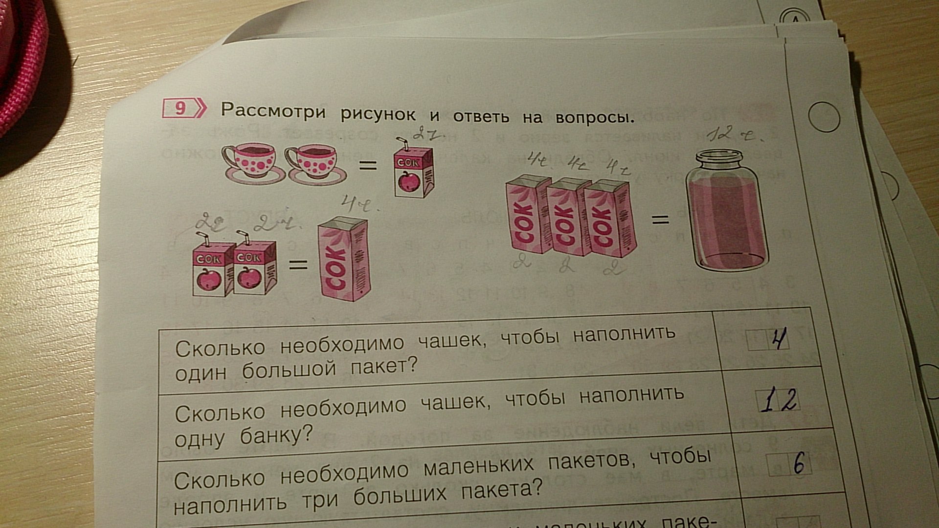 рассмотри рисунок и ответь на вопрос. сколько необходимо чашек и маленьких пакетов,чтобы наполнить банку?