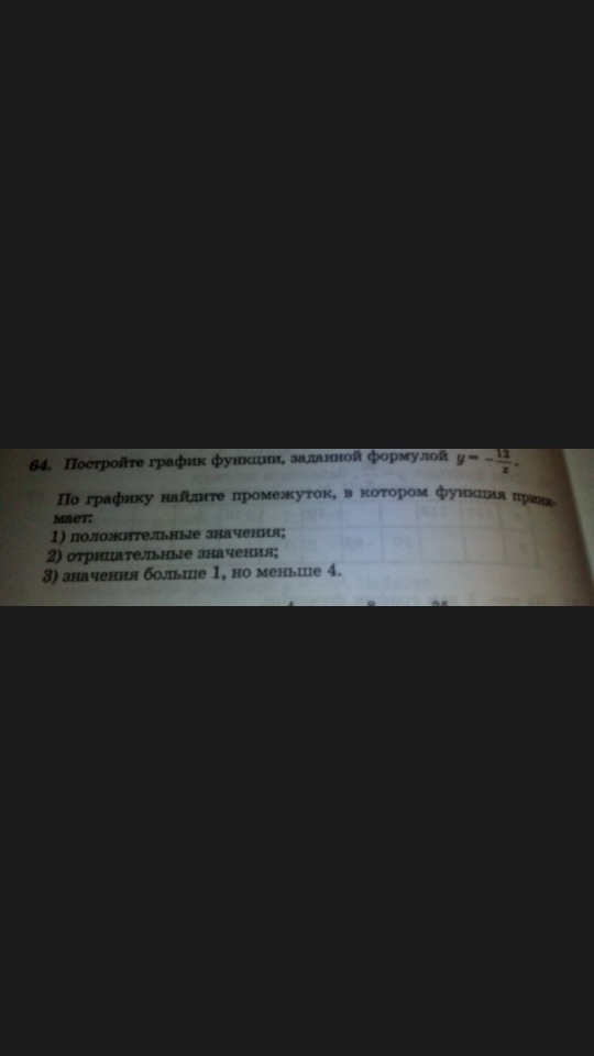 1.положительные значения: -бесконечность;0. 2.отрицательные значения: 0; +бесконечность. 3. 1=-12/х=>х=-12; 4=-12/х=>х=-3. Ответ: -12;-3